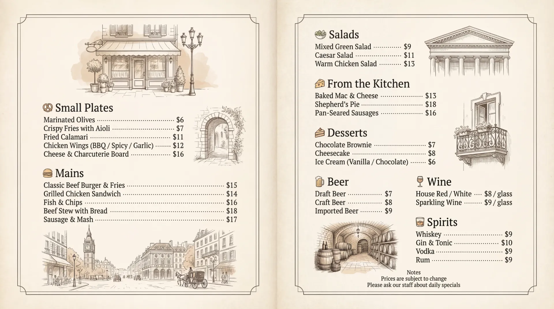 在编辑器中输入菜名、价格和简短说明。您可以按类别(如主菜或饮料)对项目进行分组。AI菜单生成器会读取文本并自动构建清晰的菜单布局。