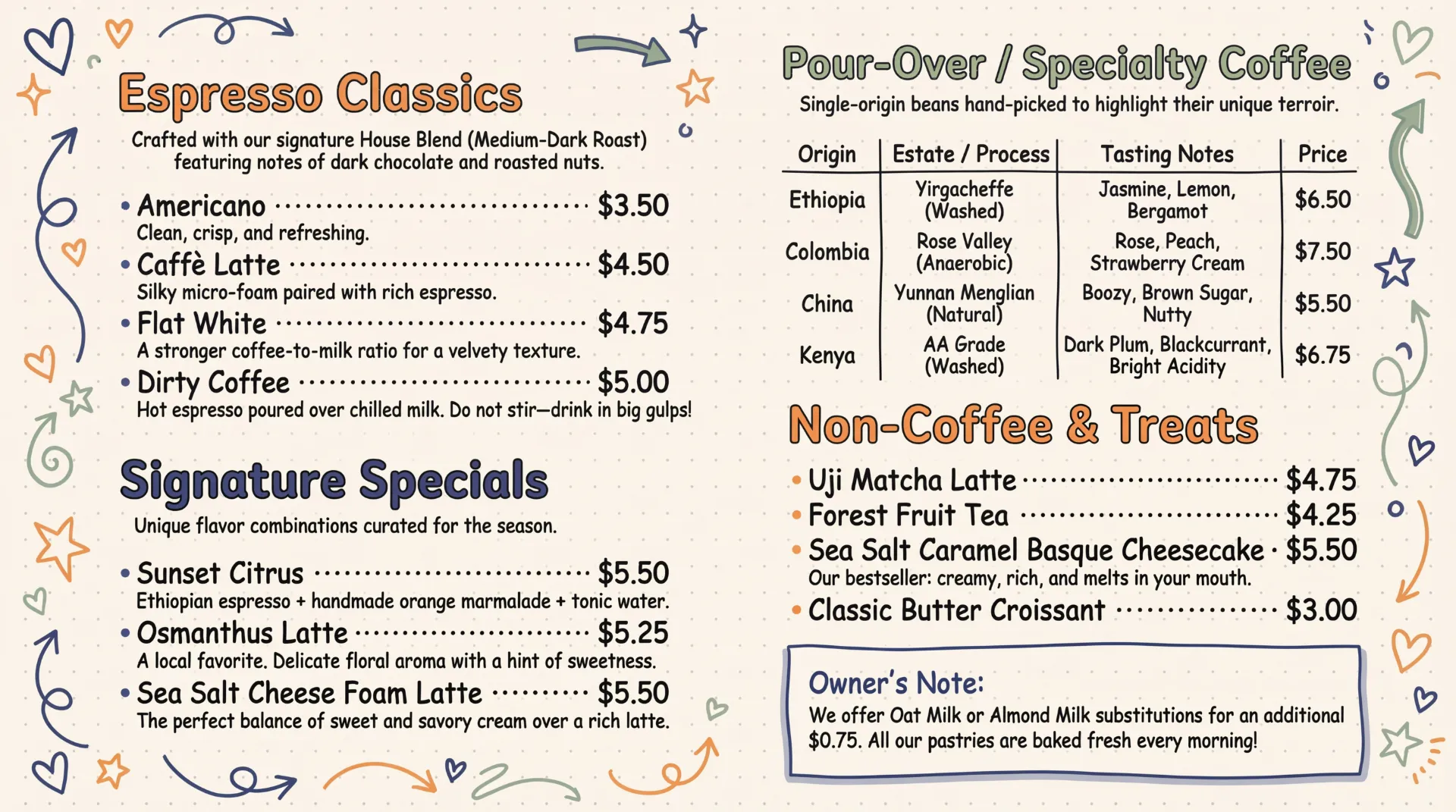 "当需要更新咖啡馆菜单时,AI菜单生成器帮我节省了大量时间。我只输入了菜名和价格,选择了风格,排版在几秒钟内就完成了。作为一个没有设计背景的人,我通常在间距和字体上很纠结,但这个AI工具自动处理了一切。最终的菜单看起来整洁、平衡且专业,无需额外编辑即可打印和在线分享。"